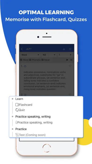 - Support learning through features such as flashcards, listening, speaking, writing, word matching,..,