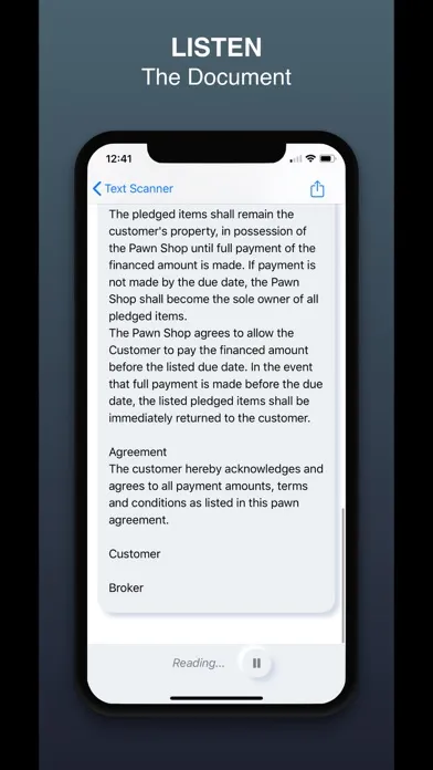 • AUDIO PLAYER. After scanning a document you can let the app read it for you. You can pause and resume the reading whenever you want.