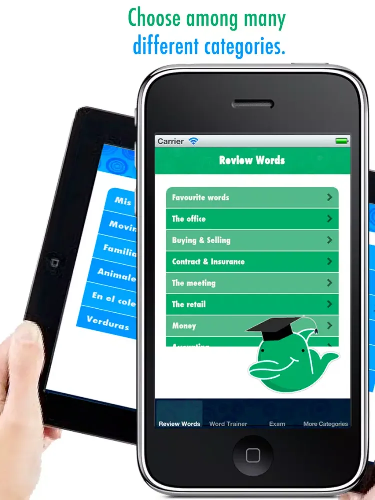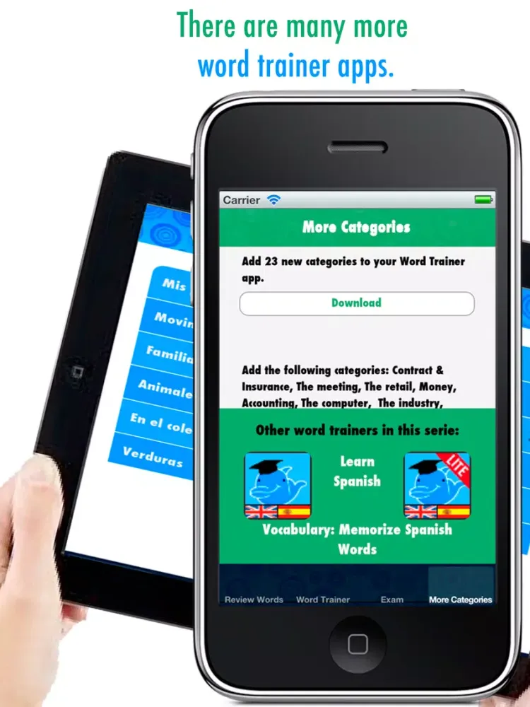 There are word trainer apps for beginners, advanced, business and children available. For a complete list of all apps: