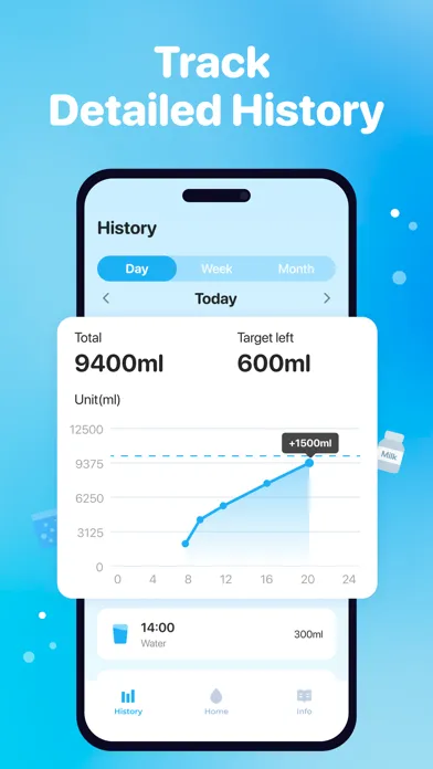 - Analyze your daily water intake with detailed charts and graphs to understand your hydration patterns.