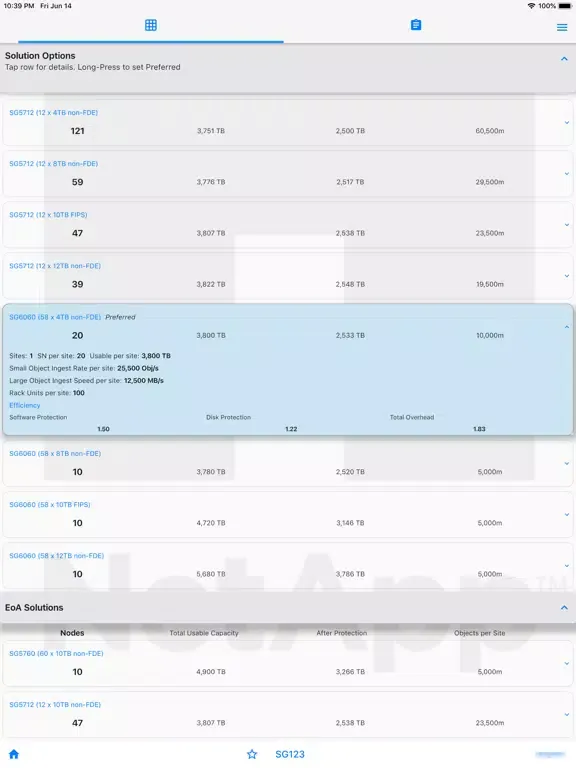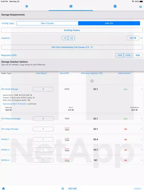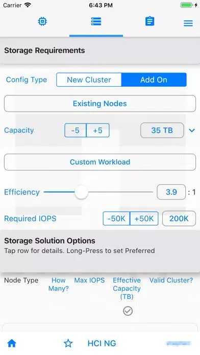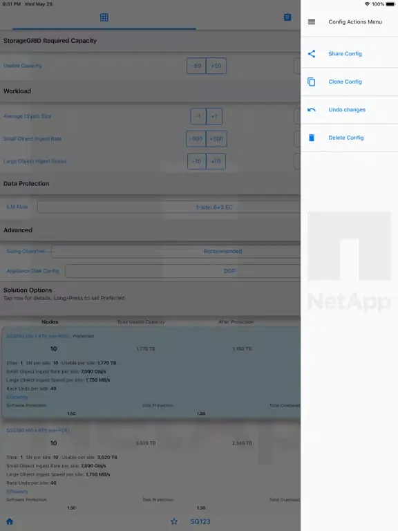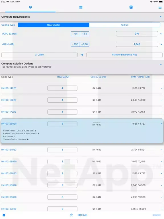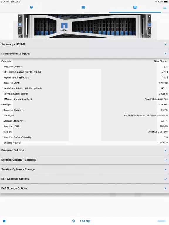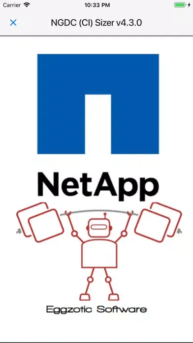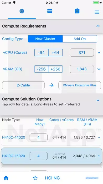 This app enables sizing of NetApp CI (formerly "NGDC") products for sales & pre-sales. Enter requirements - capacity, performance, virtual-Core count, efficiency and consolidation factors, multi-site data-protection schemes etc. Sizing for both “New Cluster” and “Add-on nodes” is included.