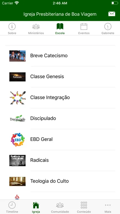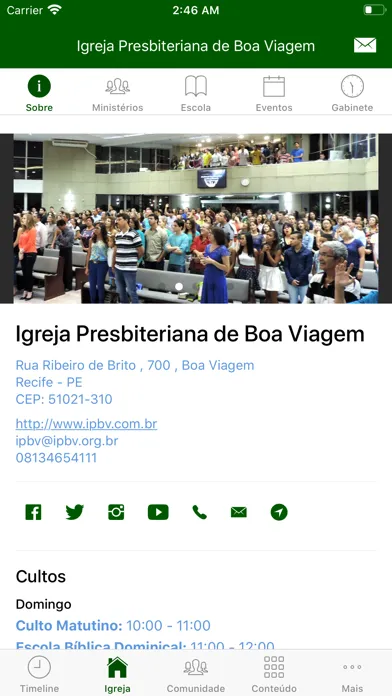- Informações da Igreja (endereço, telefone, site, redes sociais, pastores)