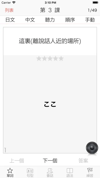 在每課的單詞部分,會有對該課單詞的簡單練習,可以順序或隨機的進行日譯中,中譯日或聽力測試,對單詞的記憶有著非常好的幫助。 每個單詞均支持3D按壓,可以通過按壓進行在線翻譯。