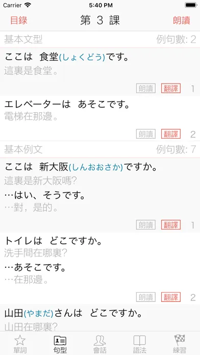 全文朗讀功能,可一鍵朗讀課文的單詞、文型、例文、會話部分,方便在出門或忙碌時練習聽力。可線控暫停和繼續播放,可線控進行下一段和上一段跳轉。