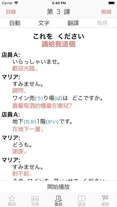 會話可隱藏指定角色對話內容來進行角色扮演。另附有真人視頻增強日語學習語境。