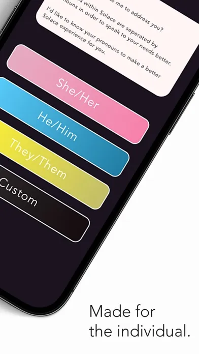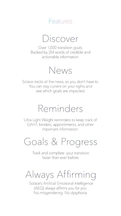 Solace is designed to allow transgender individuals to define transition on their own terms. Solace makes no suggestion as to what a ‘complete’ transition looks like, and instead is there to affirm the user and celebrate them each step of the way.