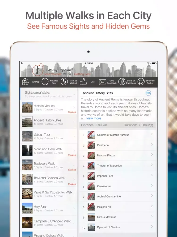 This handy application presents you several self-guided city walks, featuring the best of the city. It comes with detailed walk route maps and powerful navigation features enabling you to see the best of the city. No need to hop on a tour bus or join a tour group; now you can explore all the city attractions on your own, at your own pace, and at a cost that is only a fraction of what you would normally pay for a guided tour.