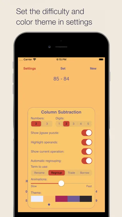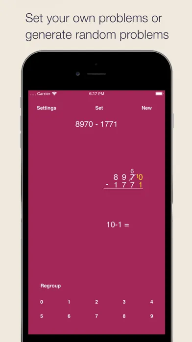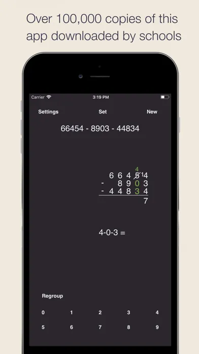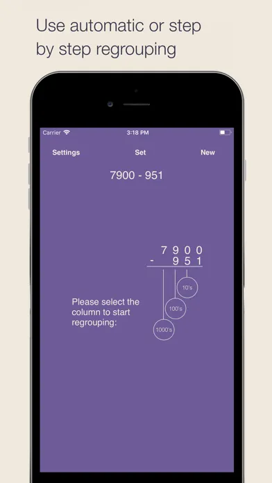This math app can be used to teach and study the column subtraction method. The app is easy to use and it has an intuitive interactive interface with customizable colors and other settings. The user can solve random or custom subtraction problems with small and large numbers. The number of digits in the numbers can be set.