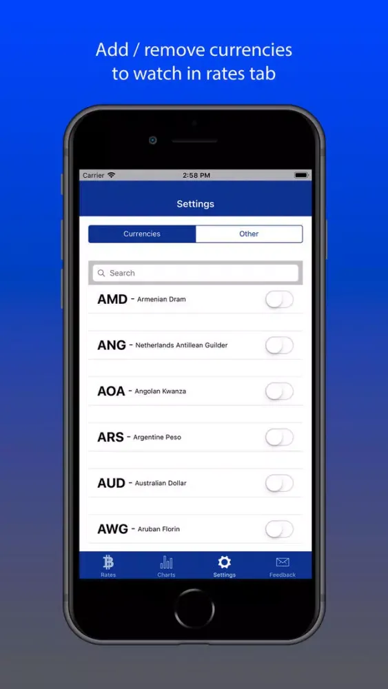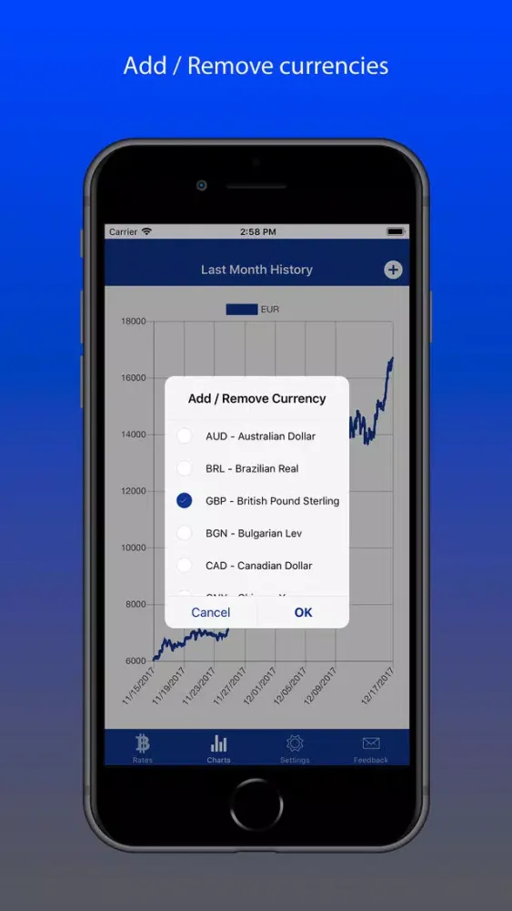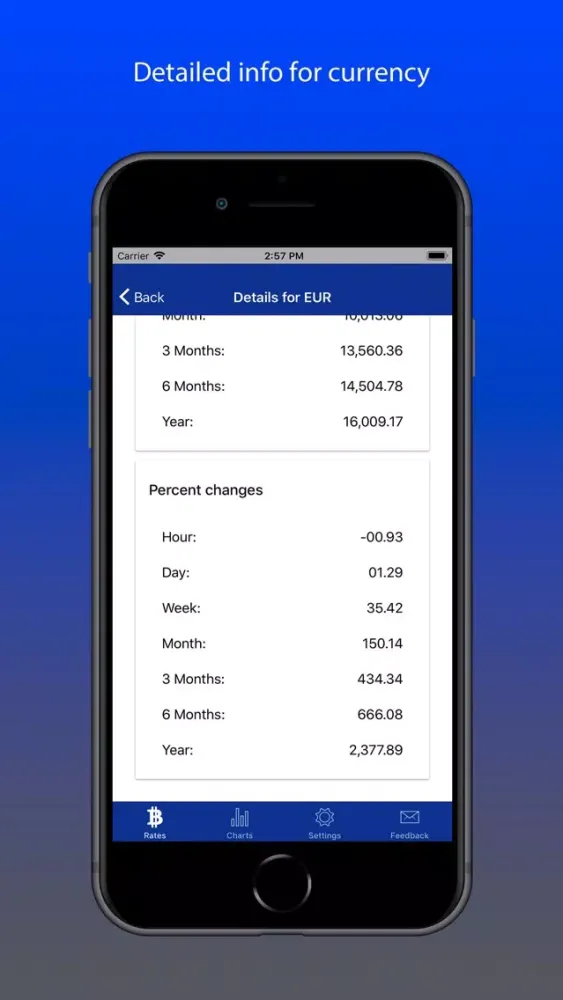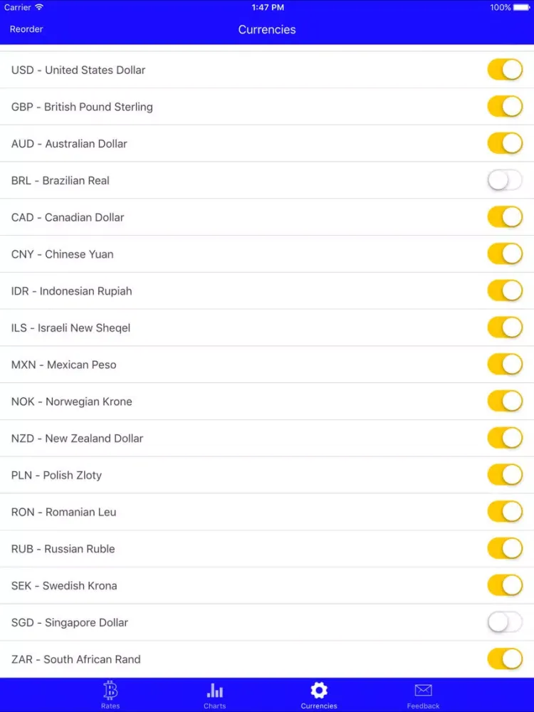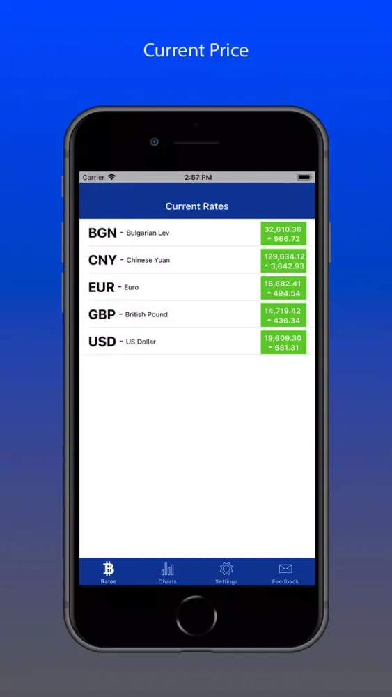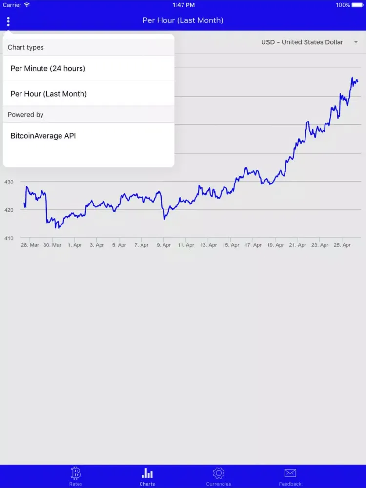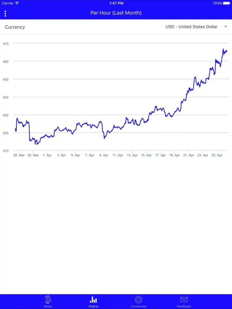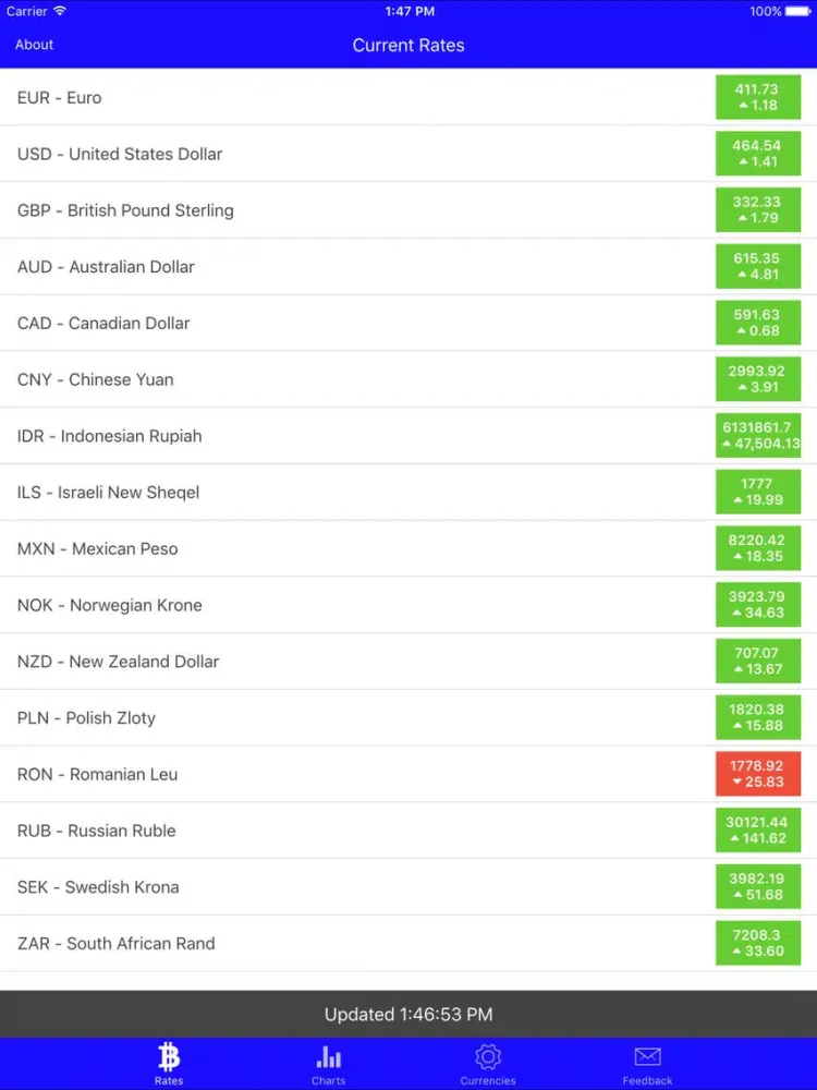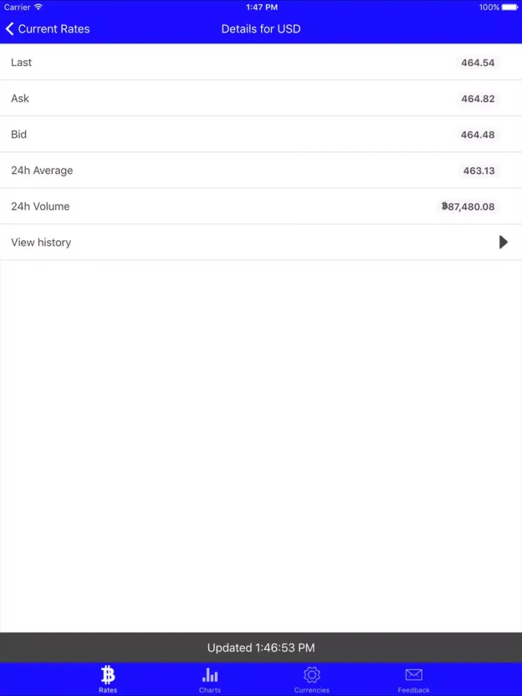 Bitcoin Rates app displays the current exchange rates (price) of the virtual currency bitcoin. There are also charts for last month rates per hours and last 24 hours per minutes. It refreshes rates every minute when opened and have the option to choose which currencies to show and also to choose in which order to list them. Rates details page has info for last, ask, bid, 24 hours average and 24 hours volume of bitcoin with selected currency..