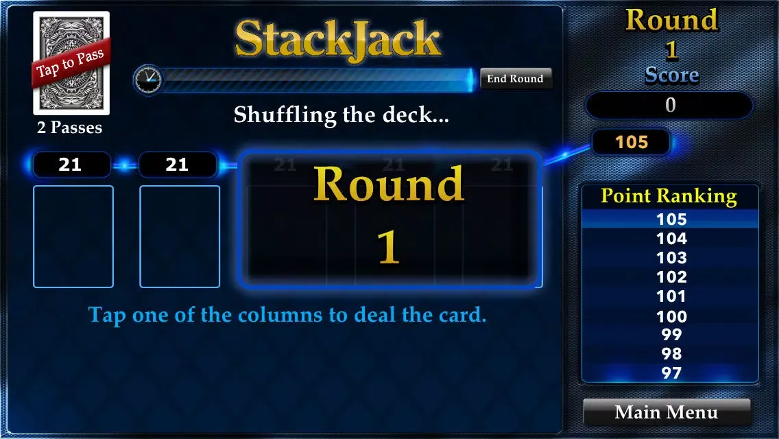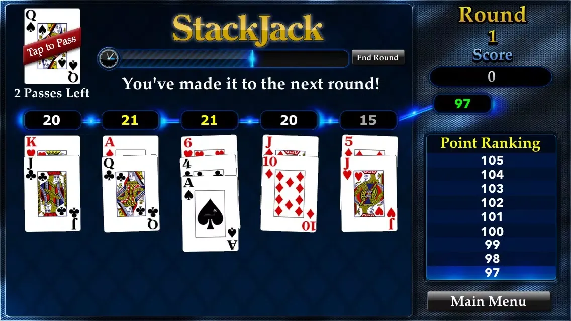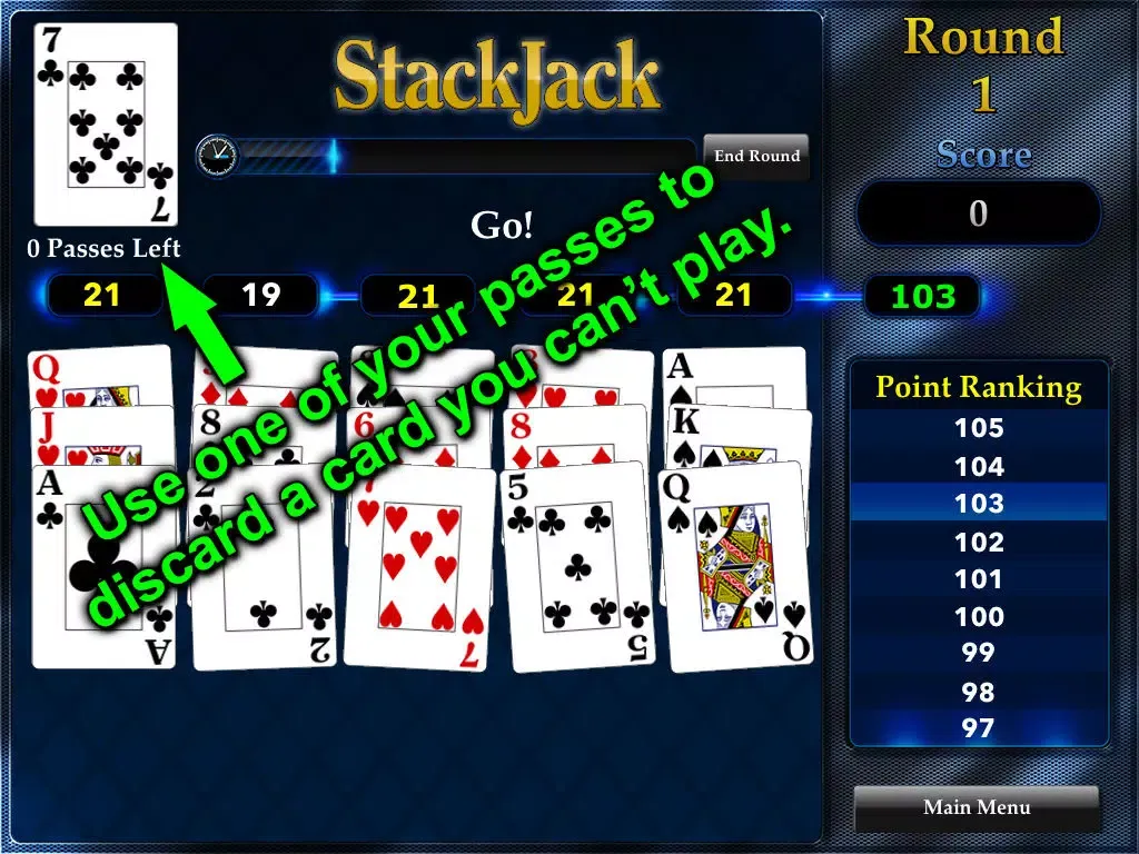 You are shown one card at the top of the deck. Choose which of the five hands to which you wish to add the card, getting each hand as close to 21 as possible without going over (or “busting”). If you don’t want to play a card, you can tap “Pass” to discard it and get the next one, but you only get a limited number of passes per round, so use them sparingly.