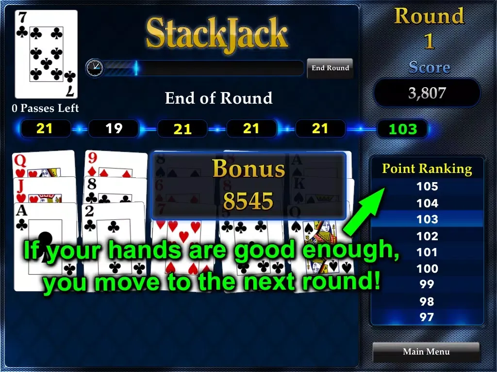 Instead of playing just one hand of blackjack at a time against the dealer, you are playing five hands at once, racing the clock, and trying to get enough points to move on to the next round.