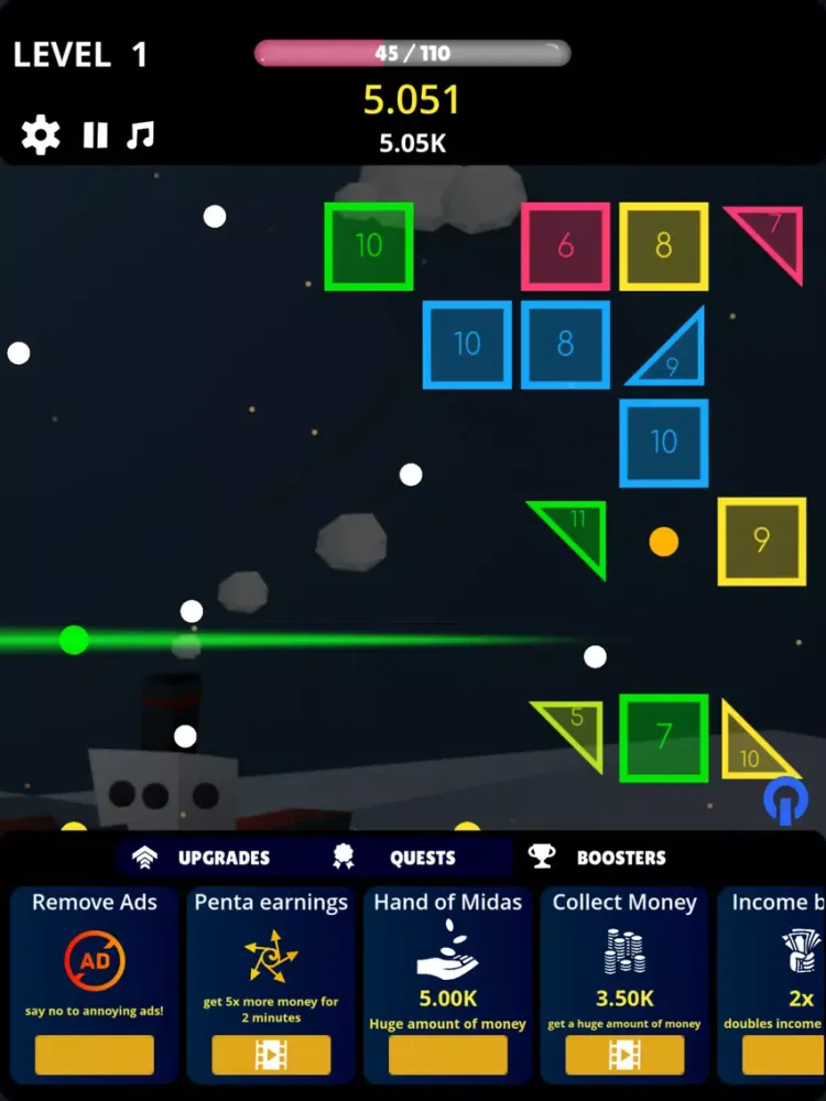 Indulge your gaming senses in idle ball shooter adventure where you are continuously blasting balls towards the numbered bricks. You will only destroy the bricks if you shoot the required number of balls. This may sound easy, but there will be large number of brick boxes and limited number of balls – so you’ll need good strategy, fast reaction and great precision.