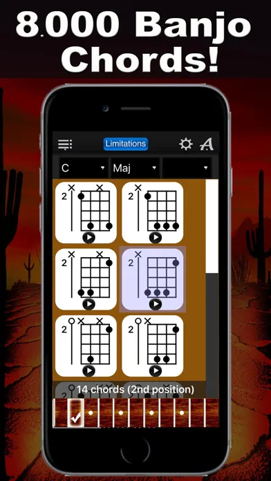 Thanks to a specially developed algorithm, the app will show you chord diagrams with all possible options in all 11 positions of the fretboard. Simply select a chord root on the left, chord type in the middle, the chord type addition on the right, and explore the chords with “Banjo Chords Compass Lite”!