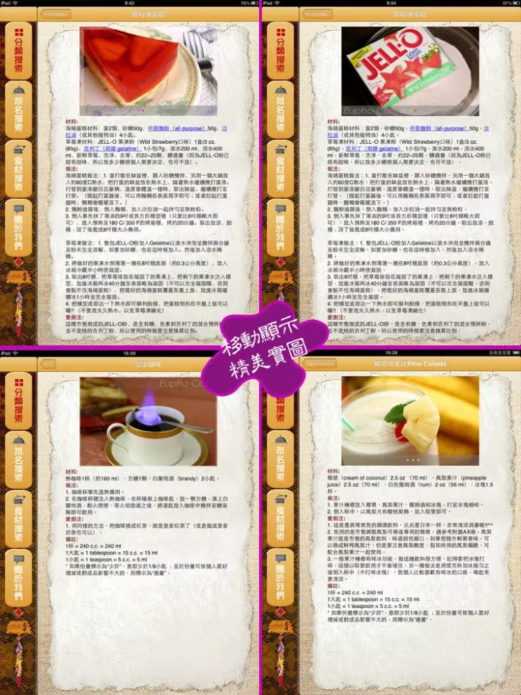 EuphoCafe由NotionInMotion.com和EuphoCafe.com 联合推出, 收录了由网络知名美食家“爱厨”亲自实践记录的400多款美食。完美支持IOS5和离线查看功能, 使您能随时随地查看, 瞬间把您的iPhone变成一本内容丰富、操作简单且成功率100%的美食菜谱。