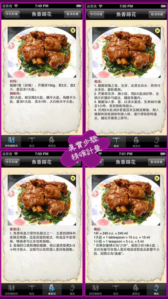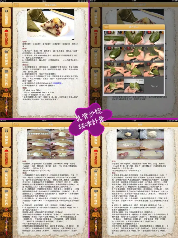 5. 大量精美图片该程序含有大量精美的步骤图和成品图, 都是由“爱厨”本人在制作美食的过程中亲自拍摄的, 图片具有真实性和可靠性。