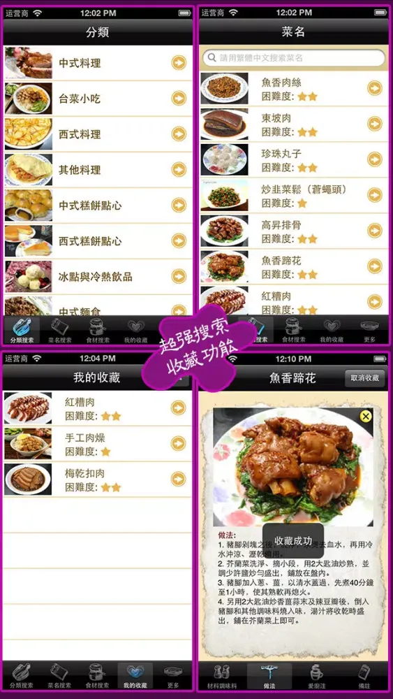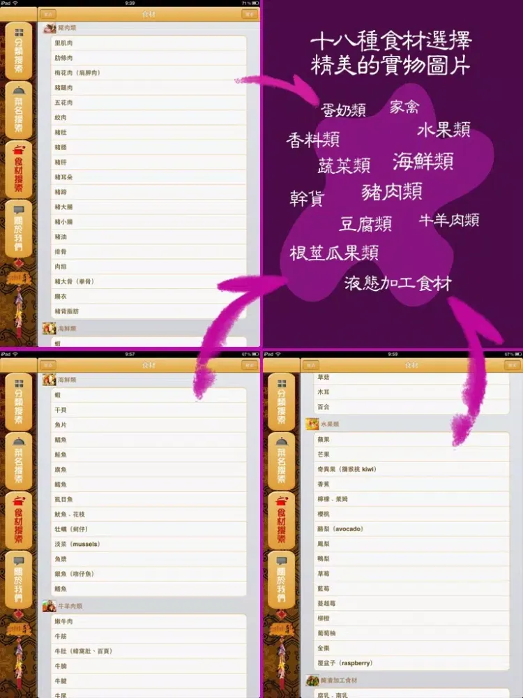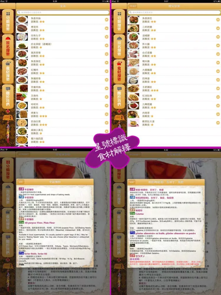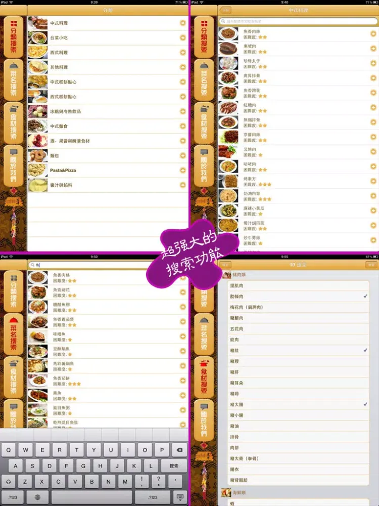 分类搜索里面包括了“中式料理”, “台菜小吃”, “西式料理”, “中式糕饼点心”, “西式糕饼点心”, “冰点和冷热饮品”等12大类。例如点击“中式料理”, 会搜索到几十款家常菜谱; 每款菜谱下面都有精美的菜谱图、材料调味料和做法的说明, 同时爱厨注有对菜谱的点评和辅料的介绍, 备注里有详细的计量单位的换算介绍。