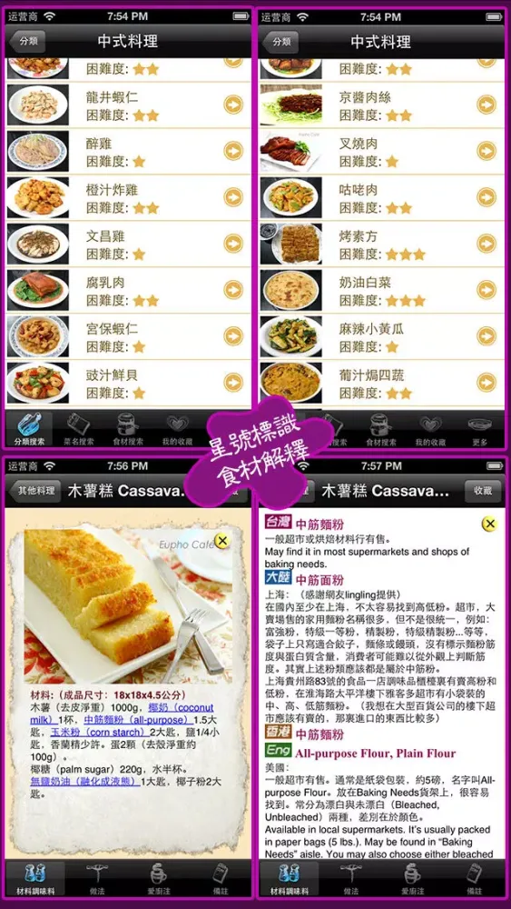 6. 关键食材的解释说明EuphoCafe的贴心之处还在于对食材的解释说明。美食的专有食材名词众多, 因为对食材的不了解从而无法制作美食, 这是最苦恼的事情。例如“草莓冻蛋糕”的“材料调味料”里“中筋面粉”, 如果您对这个食材不了解, 直接点击进入详细解释页面。里面囊括了所有关于“中筋面粉”的所有解释说明。希望通过食材的解释说明, 使您的美食道路畅通无阻。
