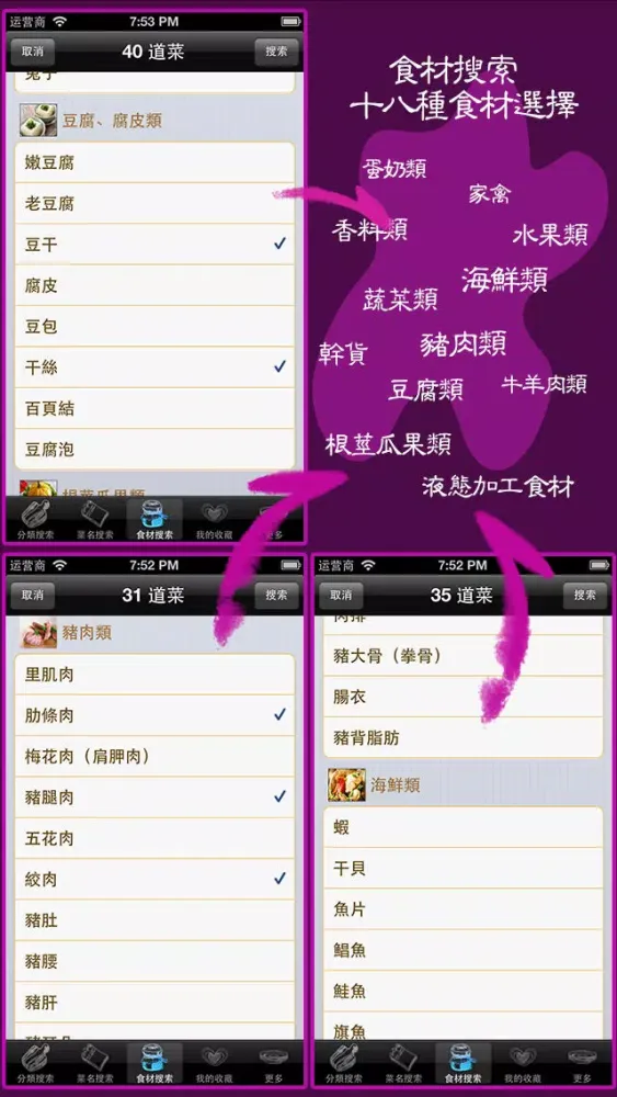 在食材搜索功能中包括了“猪肉类”, “海鲜类”, “牛羊肉类”, “根茎瓜果类”等18大类食材的分类。在每一分类里都包括了该类别中的所有食材。例如, 在“猪肉类”中就包括了“里脊肉”, “肋条肉”, “梅花肉”, “猪腿肉”等19个类别。点击“里脊肉”搜索条会出现该食材下所列食谱的数量16道菜, 包括“鱼香肉丝”、“京酱肉丝”、“叉烧肉”等菜谱。