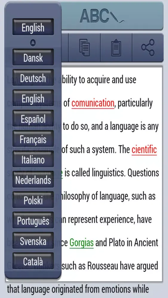 The app supports a number of languages that can be quickly selected through a main language menu. The currently supported languages are: English, Français, Deutsch, Español, Dansk, Italiano, Nederlands, Polski, Português, Svenska and Català