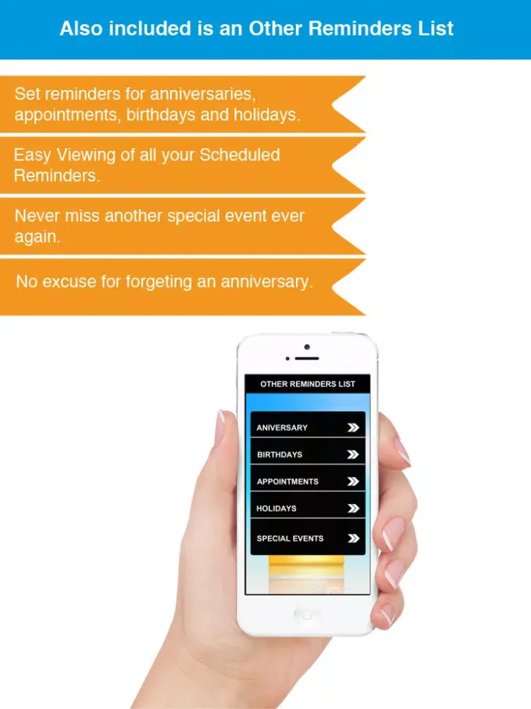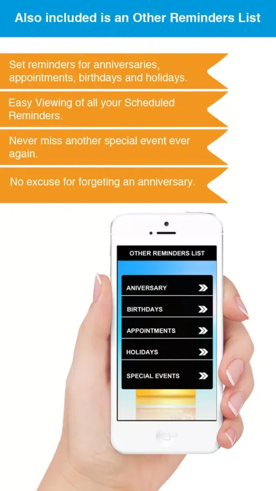 Anniversaries, Appointments, Birthdays, Holidays, Special Events.