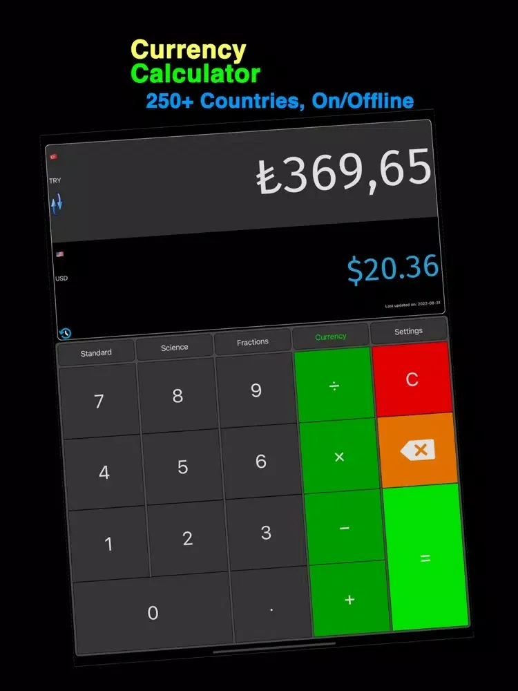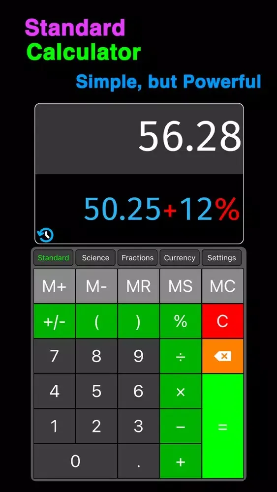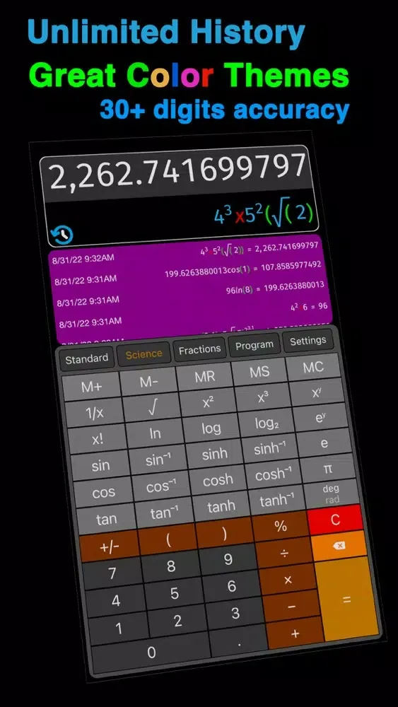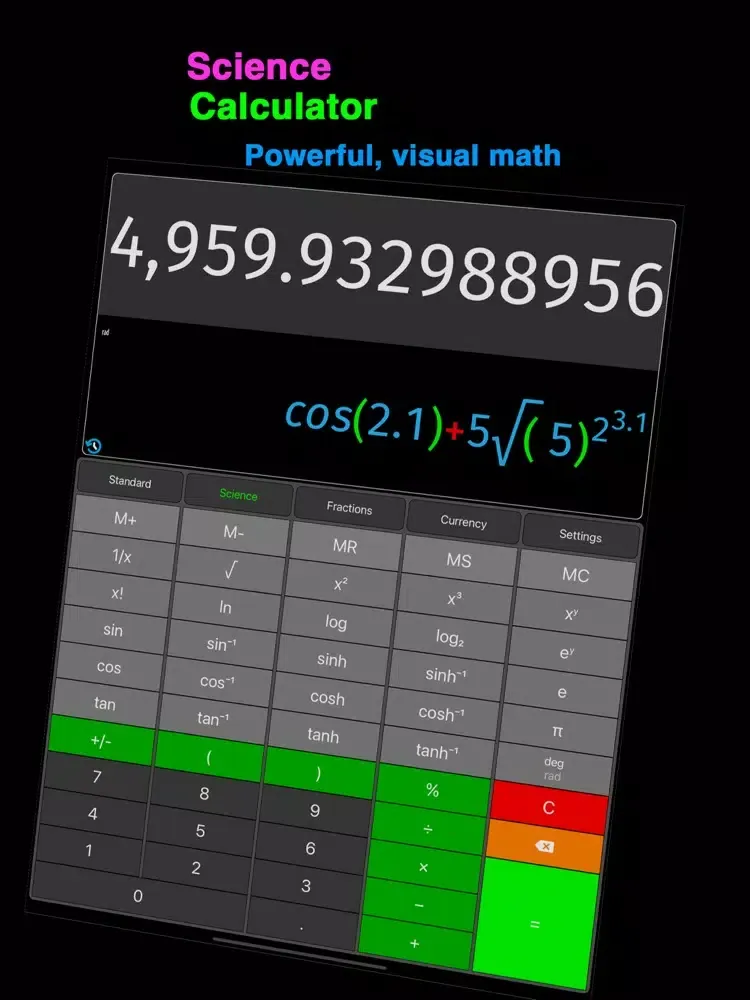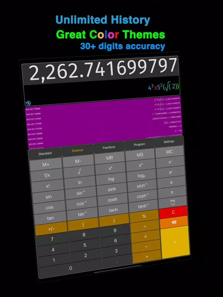 Calculators included: standard, scientific, unit conversions, financial, fractions, currency conversions, tips, and programming. Work in portrait or landscape. Easy access to your history. See expressions in color. Get the answer you need quickly. A visual tutorial is available in the settings section of the app.