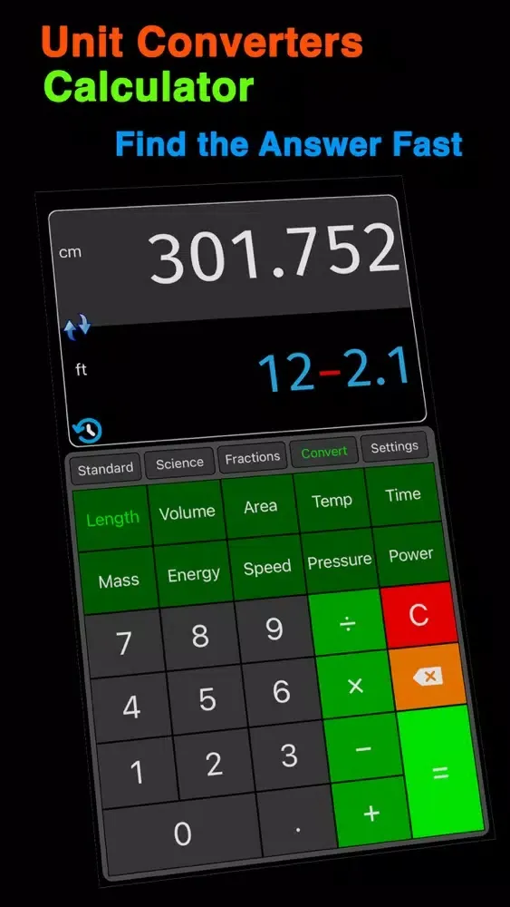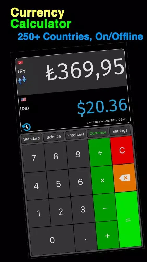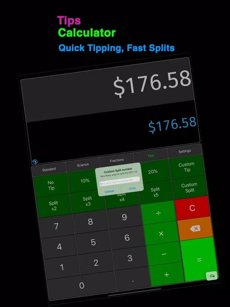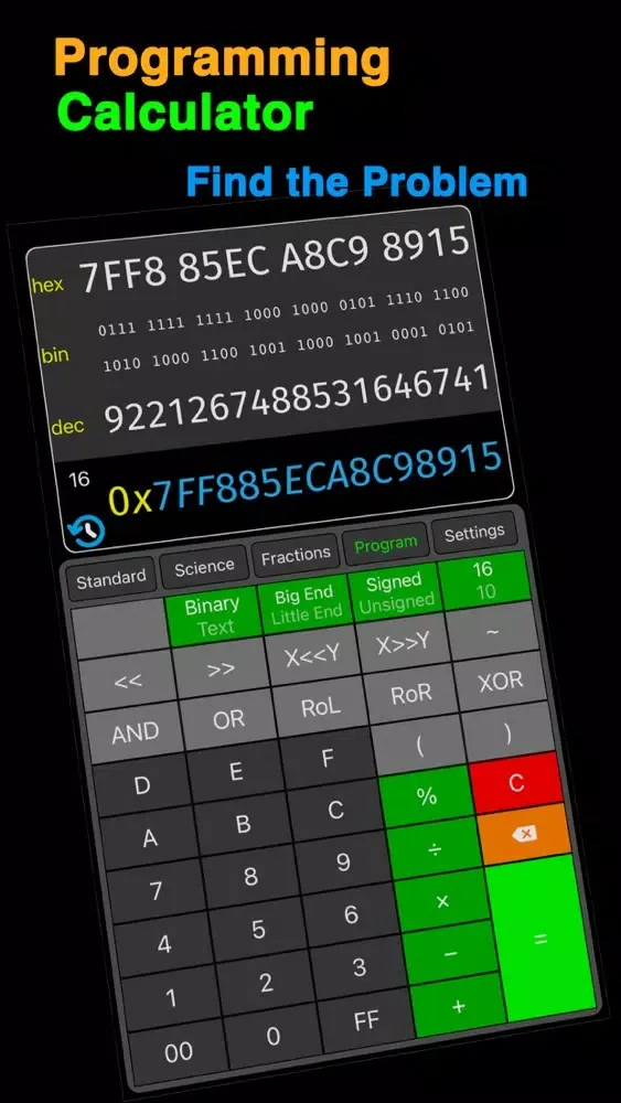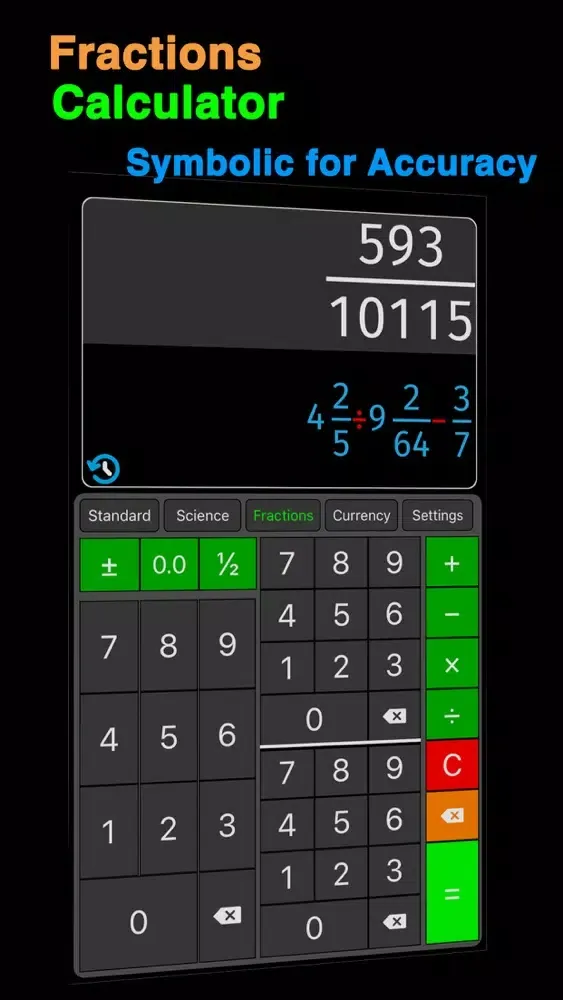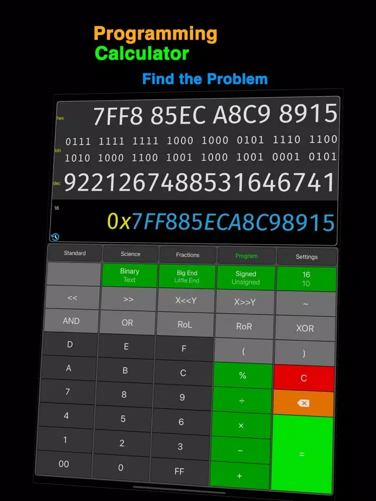 Calculators included: standard, scientific, unit conversions, financial, fractions, currency conversions, tips, and programming. Work in portrait or landscape. Easy access to your history. See expressions in color. Get the answer you need quickly. A visual tutorial is available in the settings section of the app.