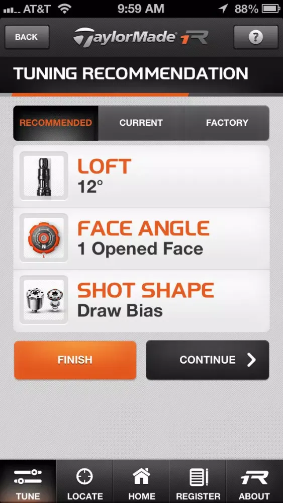 Once you have told us your handicap, if you're right or left handed and what your current R1 driver settings are, the R1 Tuning app will quickly guide you through a Tuning Session and provide you with a recommendation for your settings to achieve your desired shot shape.