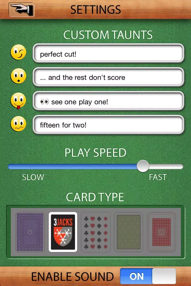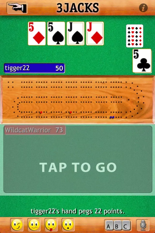 3Jacks Cribbage is a fantastic new version of the classic card game of Cribbage that lets you play your friends anytime and anywhere you are. With Apple's innovative Game Center technology at the heart of the action, you and your friends are guaranteed to have a blast! We’ve designed our Cribbage game in the same vein as our popular dice games 10,000 and High Roller. Fast and fun game play! Our goal is to get you playing a game of Cribbage with your buddies without it taking an afternoon to complete. Plus with in-game chat, custom taunts and full voice chat support, skunking your opponent has never been so much fun!