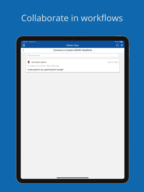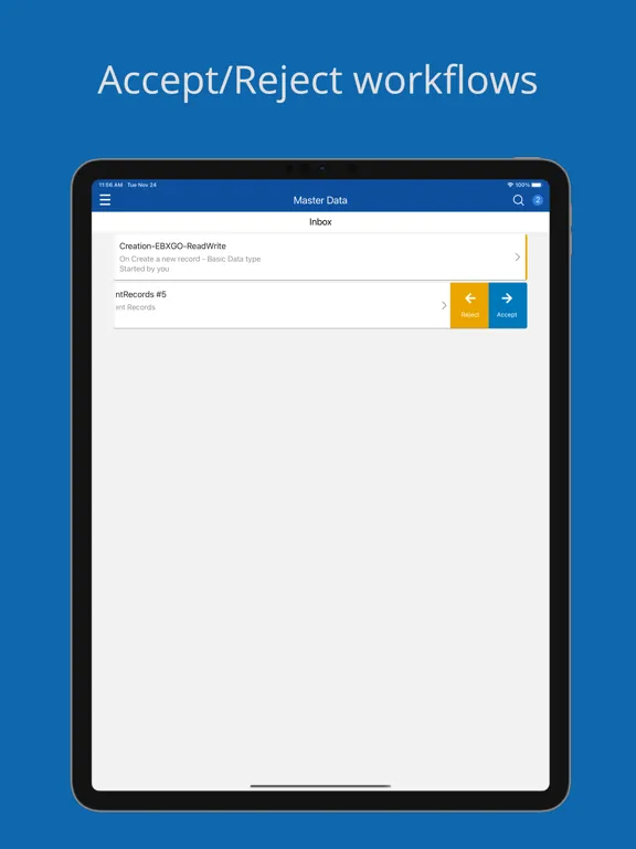 TIBCO EBX™ GO brings enterprise data management to your mobile device. Manage and govern your master data, reference data and metadata on the go. TIBCO EBX™ GO delivers all the TIBCO EBX™ features you like, including workflow, hierarchies, search and more.