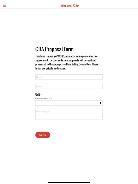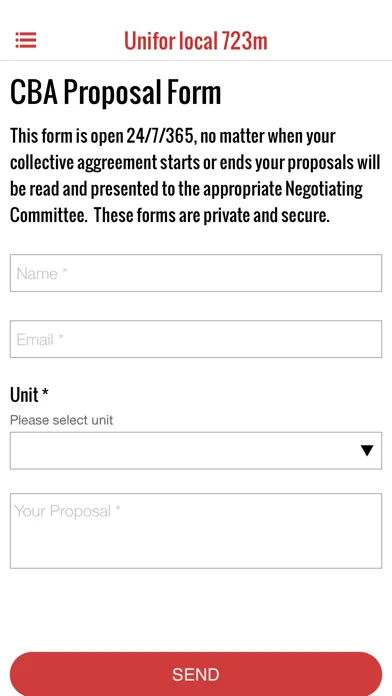 Unifor Local 723m member information and news. The app includes the local units CBA's and a calendar of events. Push notifications will be sent out to inform members of upcoming meetings and events. A CBA proposal form is available 24/7/365 for members to submit proposals for their collective agreements.