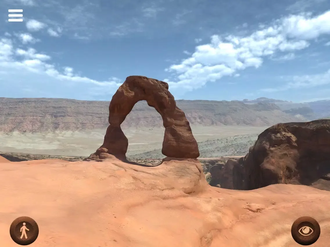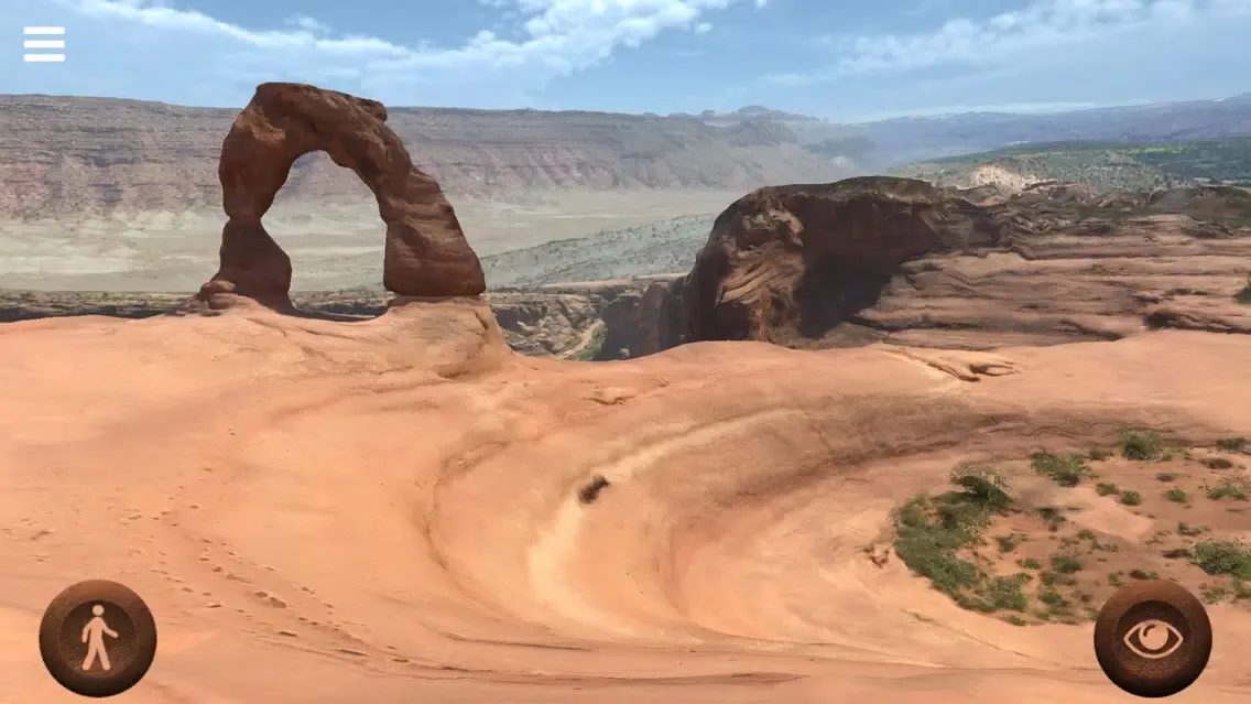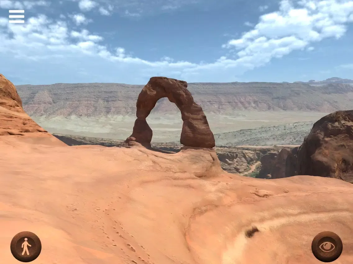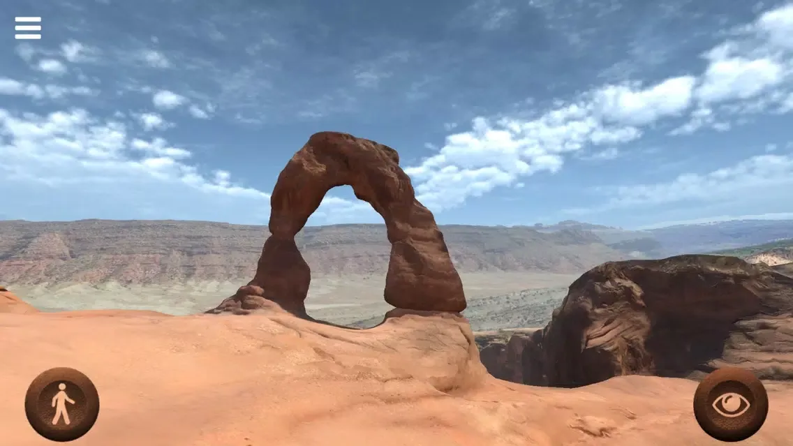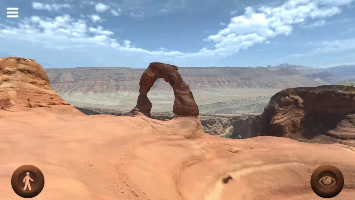 With this application you can freely walk around the "Delicate Arch", a 20 meter freestanding natural arch located in the Arches National Park, Utah, United States of America. Move your joypads to walk around and see the place. Walk under the arch and enjoy the view. Photo-realistic quality of this virtual reconstruction will really give you the feeling of being there.