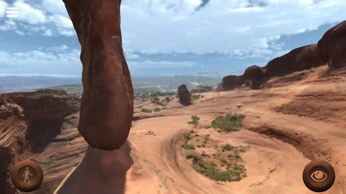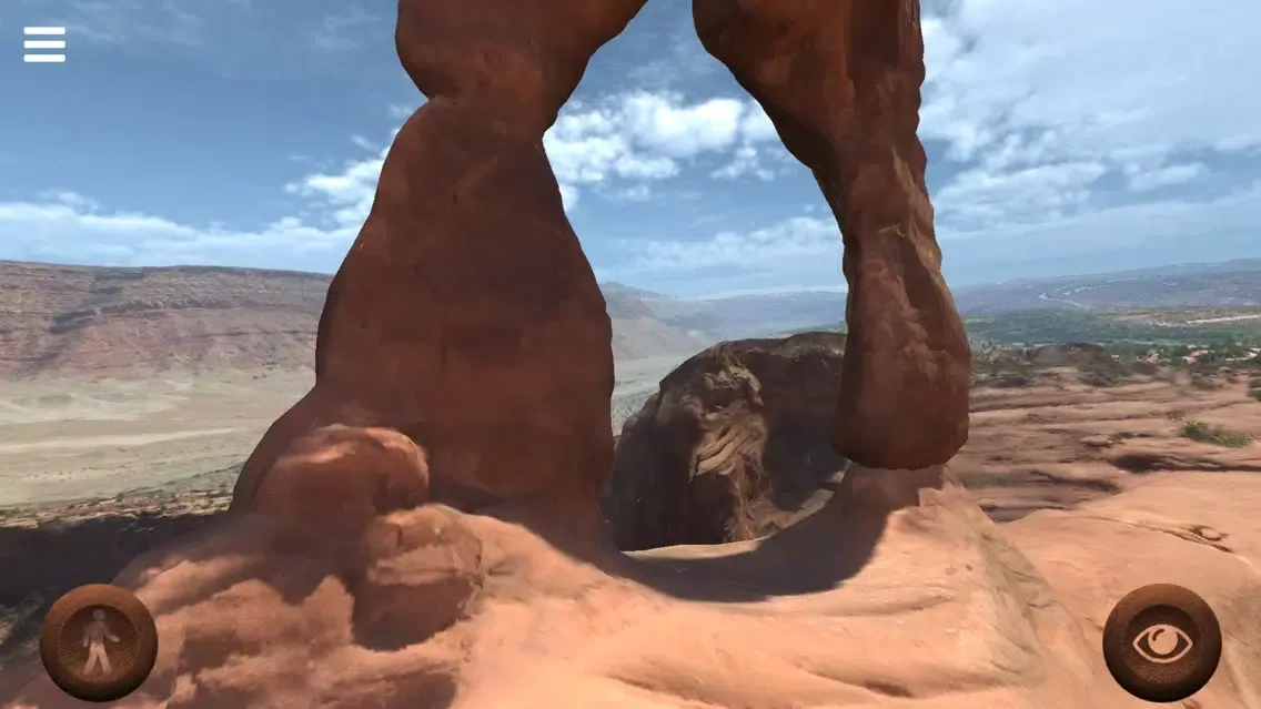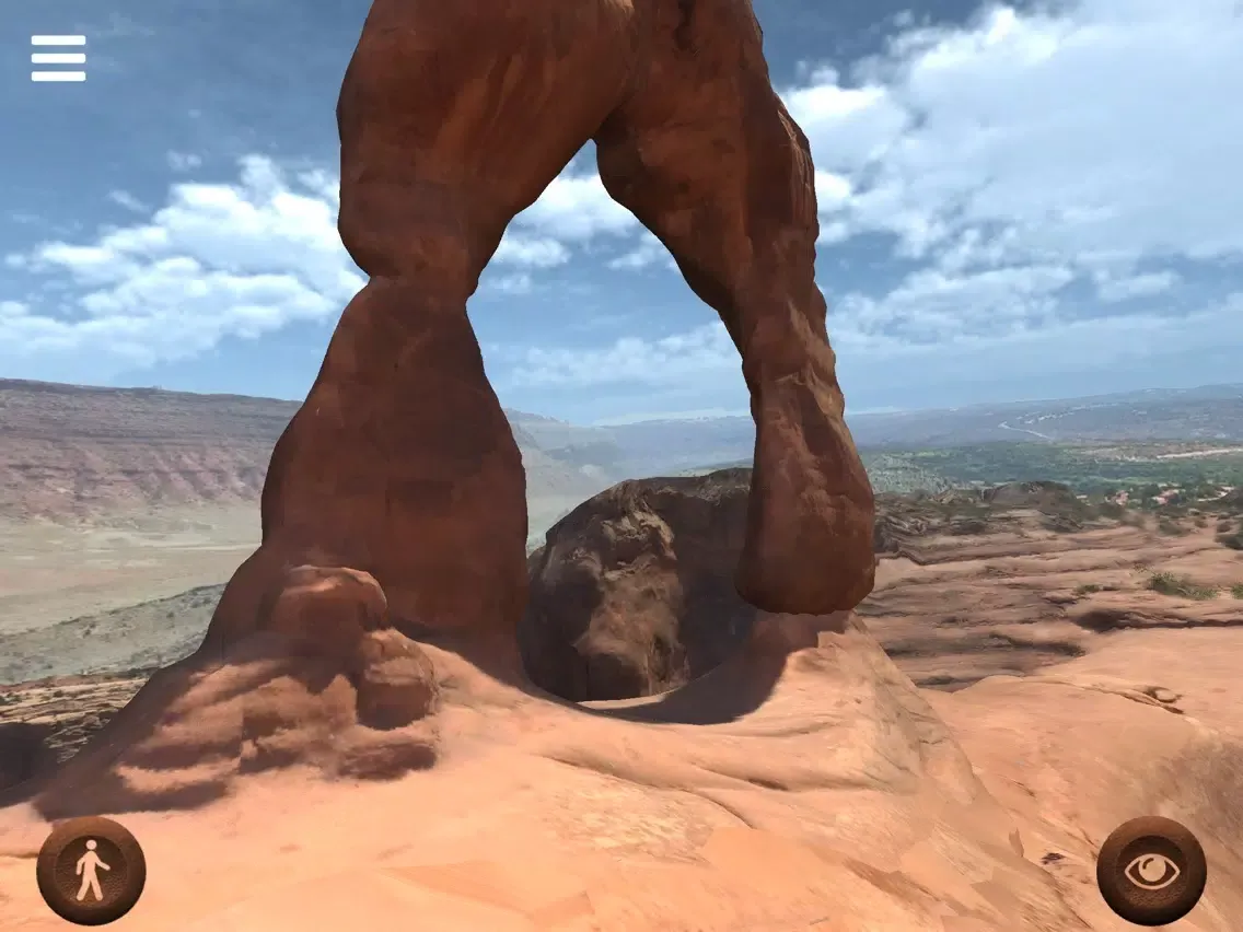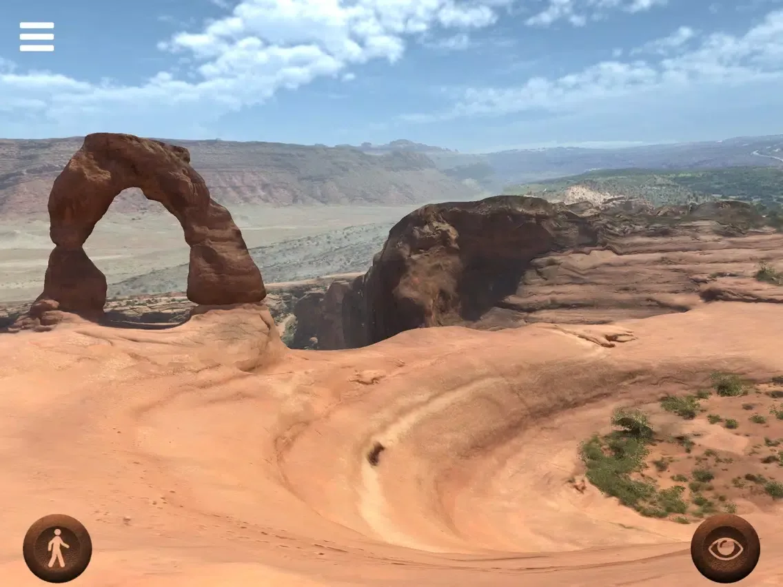 With this application you can freely walk around the "Delicate Arch", a 20 meter freestanding natural arch located in the Arches National Park, Utah, United States of America. Move your joypads to walk around and see the place. Walk under the arch and enjoy the view. Photo-realistic quality of this virtual reconstruction will really give you the feeling of being there.