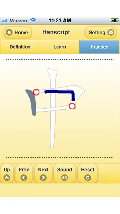 Three levels of difficulty are available during practice mode: easy, medium, and hard. In easy and hard modes, all and none of the stroke outlines are shown respectively. In medium mode, 50% of the strokes outlines are shown randomly.