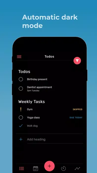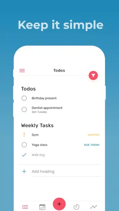 Create lists for anything! Lists can contain repeating tasks, or simple todos. Create grocery lists, todo lists, gym routine; anything you want!