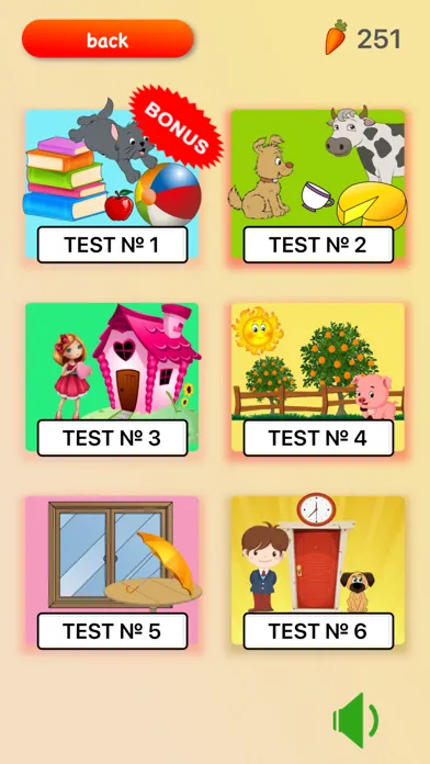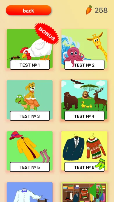 Two tests to test knowledge. For now only for 47 words (1st level). For passing tests are awards that can be spent on the game.