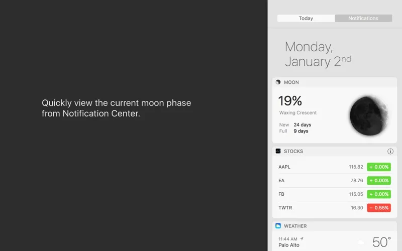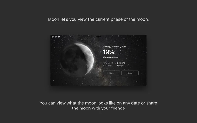 Never be caught off-guard by moon-related craziness again. View the current moon phase, see what the moon will be like on a certain date, see countdowns to moon events, receive notifications with enough time to avoid unpleasantness, and share the moon phase with your friends.