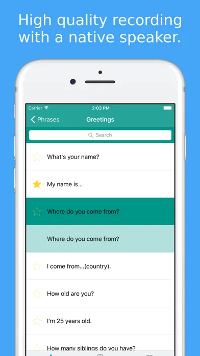 * Advanced Conversation * Health * Border Crossing * Questions * Places * Food * Vegetables * Fruits * Colors * Romance I * Romance II * Post Office * Phone & Internet * Banking * Occupations * Business Talk * Hobbies * Feelings * Body * Animals * Family * Countries