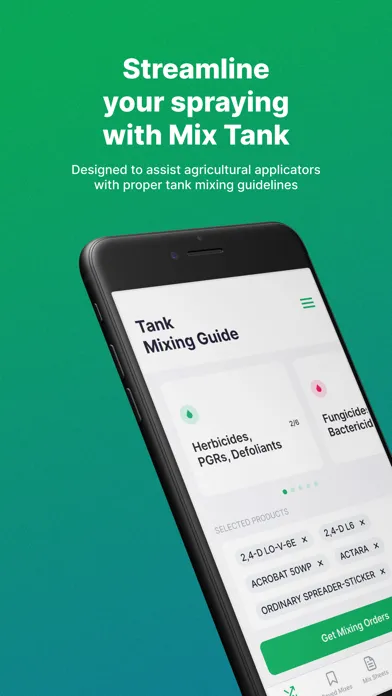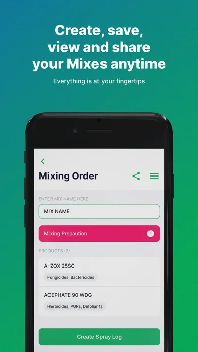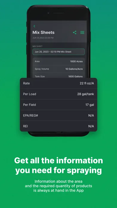 •Mix Sheets: enter field size, spray volume, tank size and product use rates and receive rate per acre, per tank and per field for accurate documentation and compliance. Easily share to integrate with existing records.