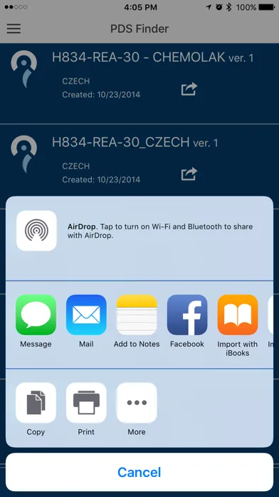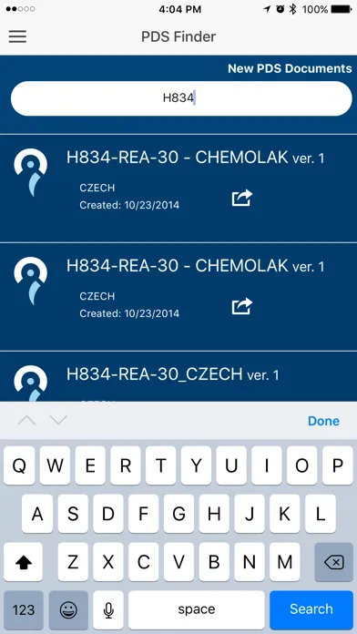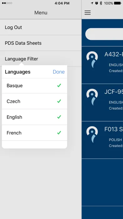 Once logged in you can begin your search by providing a complete or partial product name, and a list of our products will be returned. To filter your data sheets by language, tap the menu icon on the upper left and uncheck the languages you do not wish to see. You may review the product data sheet by tapping on the PDS icon to the left of the data sheet details. To share a data sheet simply tap the share icon to the bottom right of the details.