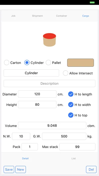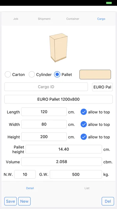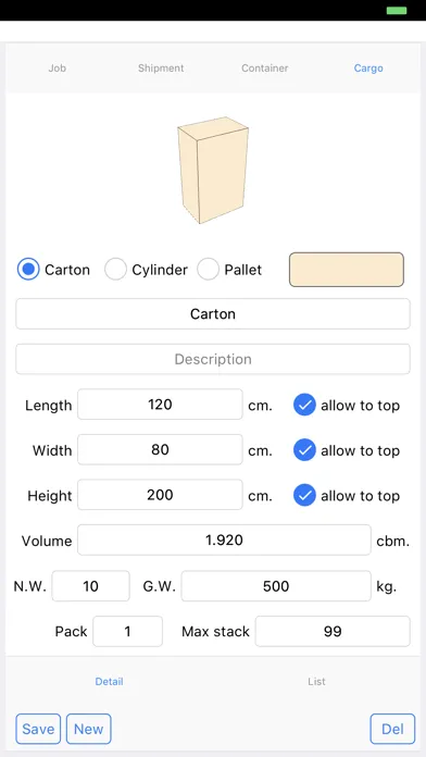 - define cargo type between carton, pallet and cylinder