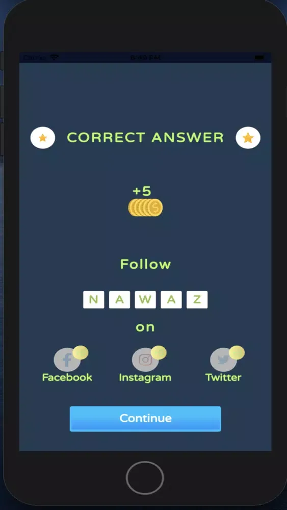 A celebrity quiz app that simultaneously allows users to enhance their social media reach.