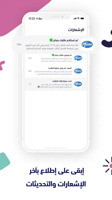 - الاطلاع على اخر الاشعارات والتحديثات عند تغير حالة طلبية أو تخصيص طلبية جديد للمندوب.