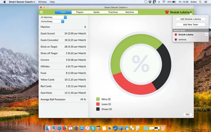 - Team: Analyze team performance (games won / lost, goals scored / lost, average ball posession, discipline and more). Stats can be sorted by competition or match host.