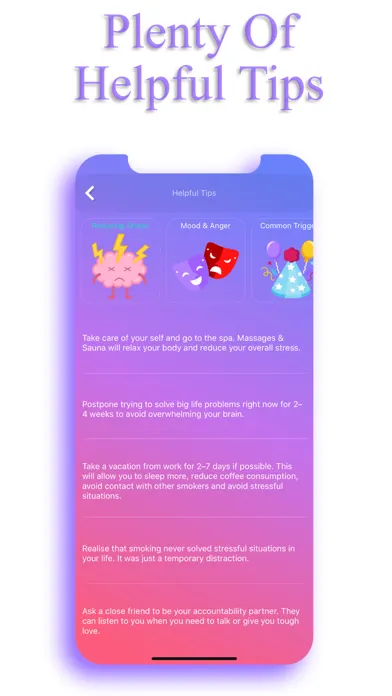 - Let the app help you decide your next step after a relapse by recommending a certain action based on your previous quitting data (Pro Version).