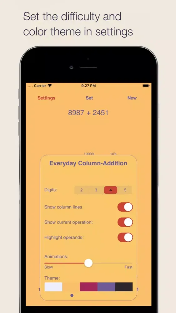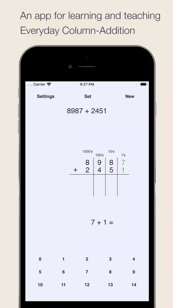This app can be used to teach and study the alternative column-addition method used in the Everyday Mathematics curriculum developed by the University of Chicago School Mathematics Project. The app is easy to use and it has an intuitive interactive interface with customizable colors and other settings.