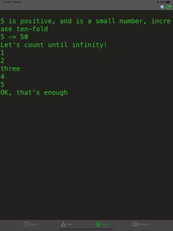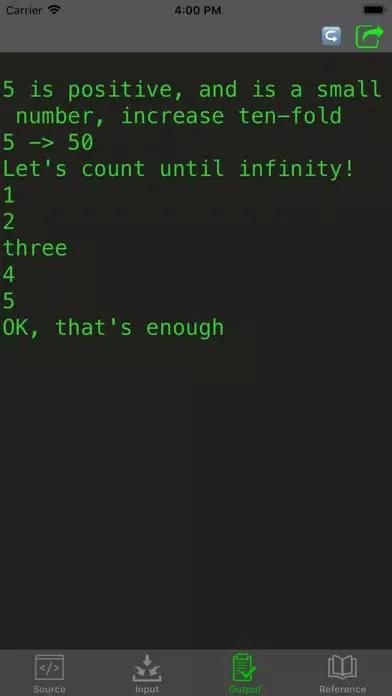 - This is a batch compiler; interactive programs are not supported. If your program provides an input prompt, enter the input in the Input tab prior to compilation. See the Reference tab in the app for code examples.