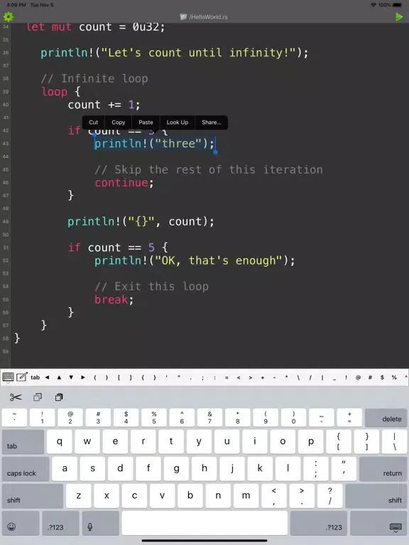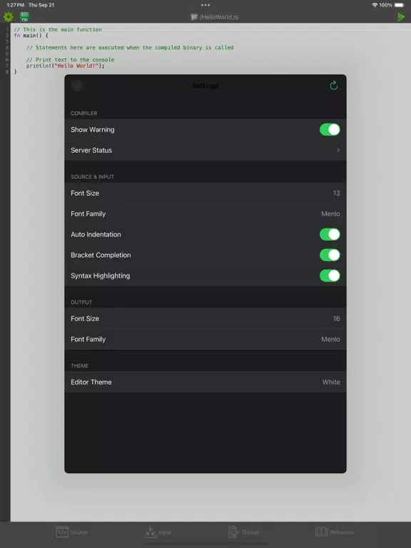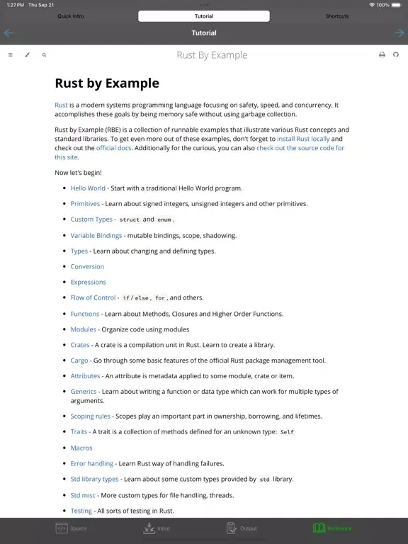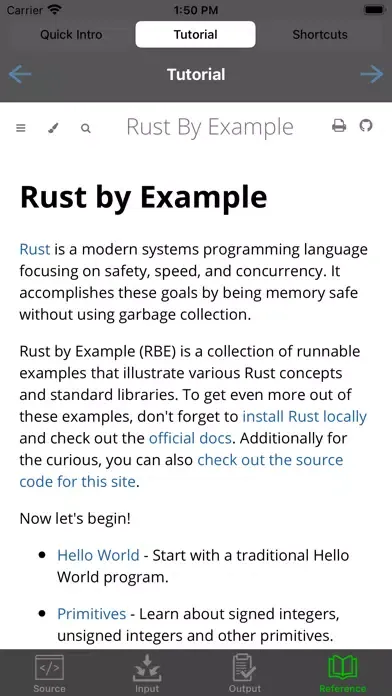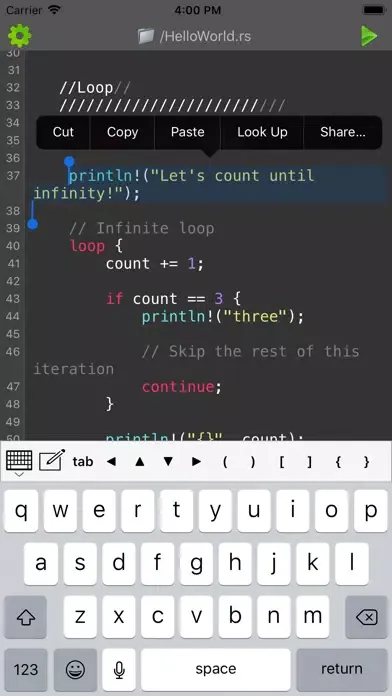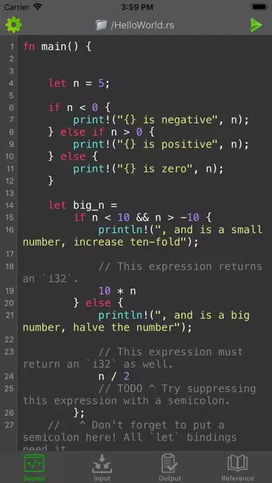Write Rust code directly on your iPhone, iPad and iPod Touch! This app is ideal for learning and testing code snippets!