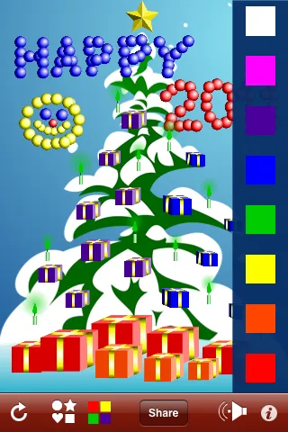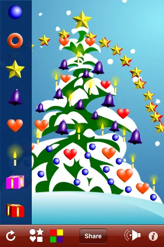 App includes a tree, differently shaped decorations; ball, ring, star, bell, heart, candle and gifts, variety of colors that can be applied to each decoration and arbitrary size for individual decorations from tiny to XXL. User’s taps, drags and pinches are accompanied by nice sound effects. Creative process is enhanced with soothing snowflakes animation and violin Jingle Bells background music.