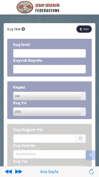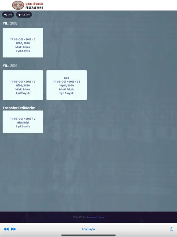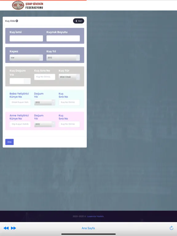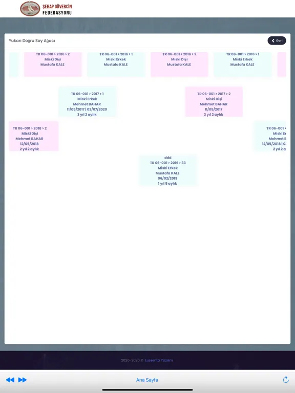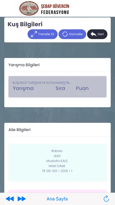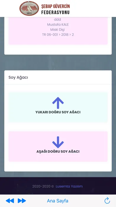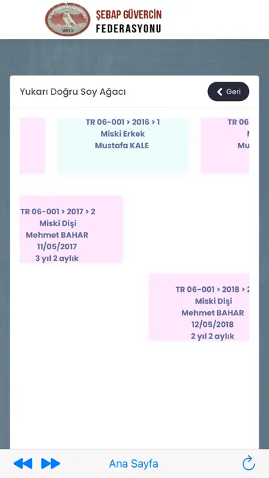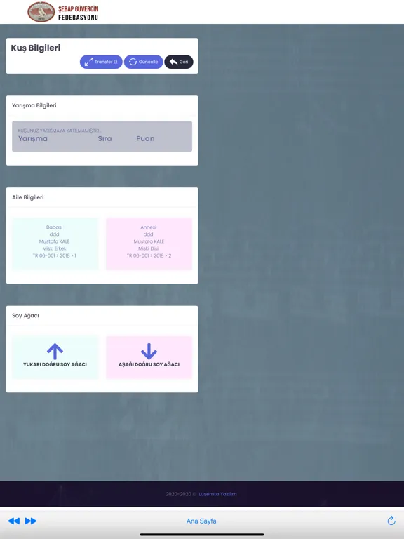 Şebap Güvercin Federasyonuna ait kuşların sisteme künyelerine göre kayıt edilmesi sonucu soy bilgilerine ulaşılabilmektedir.