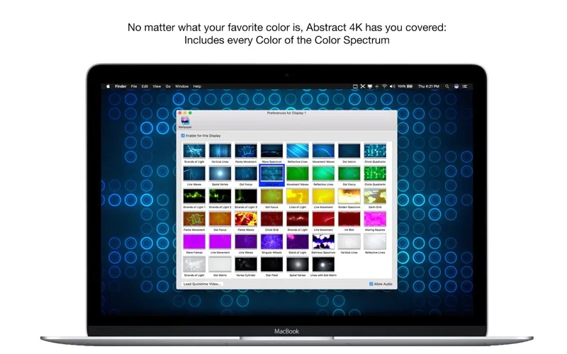 - 4K Videos include: Strands of Light, Wave Spectrum, Reflective Lines, Circle Quadrants, Earth Grid, Star Field, and more